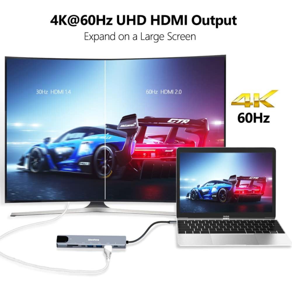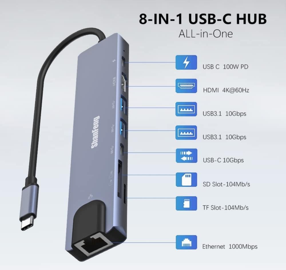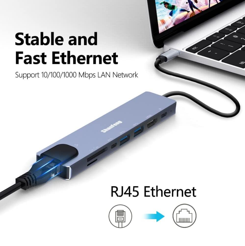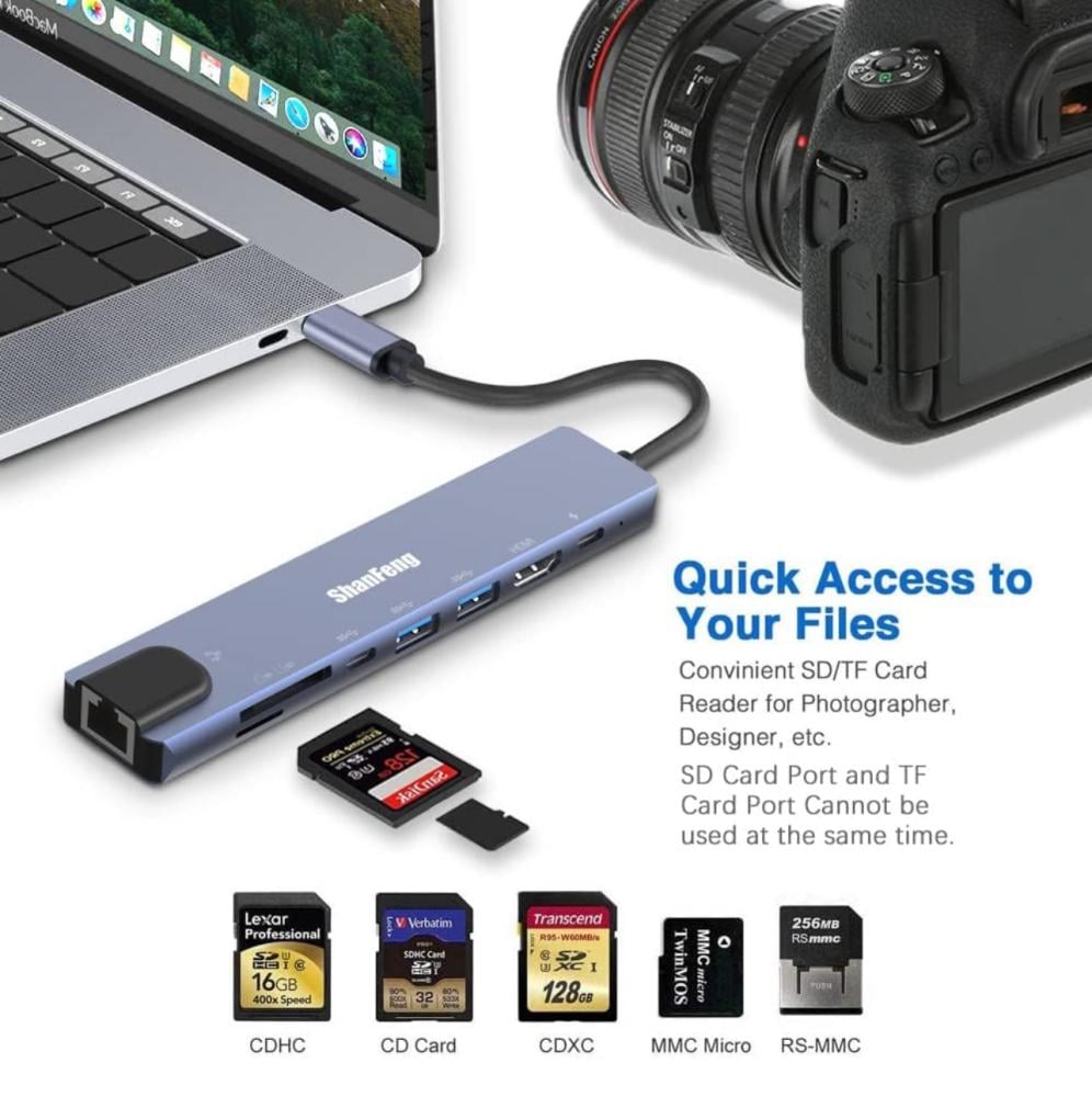 • توسيع هائل 8 في 1: مزود بمنفذ شحن USB نوع سي بي دي 100 واط، 1 منفذ بيانات USB-C بسرعة 10 جيجابايت في الثانية، 2 منفذ بيانات USB-A بسرعة 10 جيجابايت في الثانية، 1 منفذ HDMI 4 كيه 60 هرتز، 1 منفذ ايثرنت 1 جيجابايت في الثانية، 1 قارئ بطاقات microSD/SD، مما يمنحك الحل الأفضل - كل ذلك من منفذ USB-C واحد. (نصائح: لا يمكن أن تعمل بطاقة اس دي وبطاقة تي اف في نفس الوقت.)