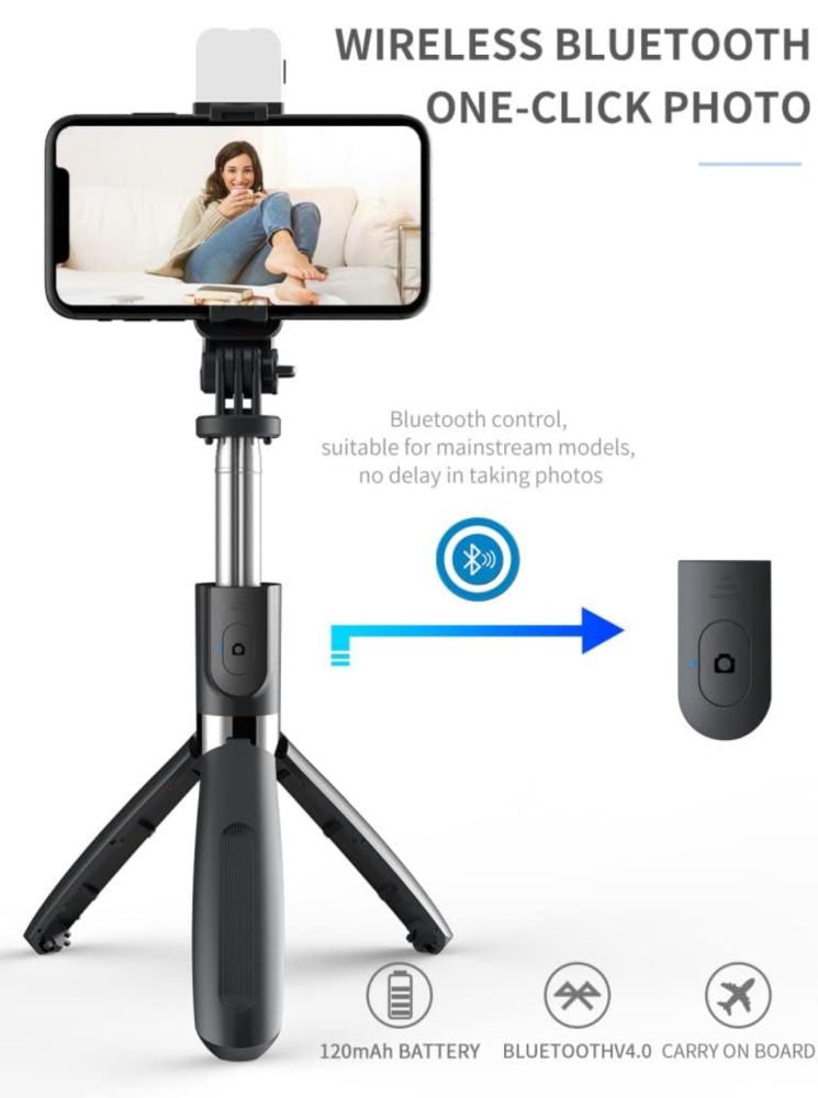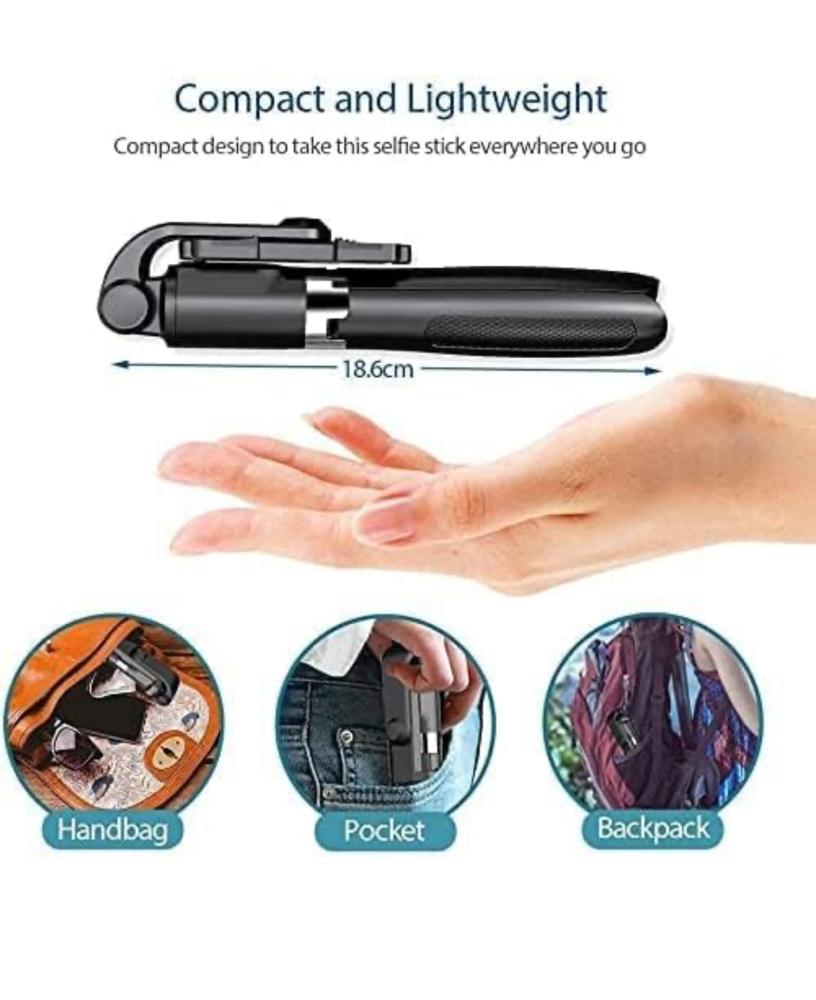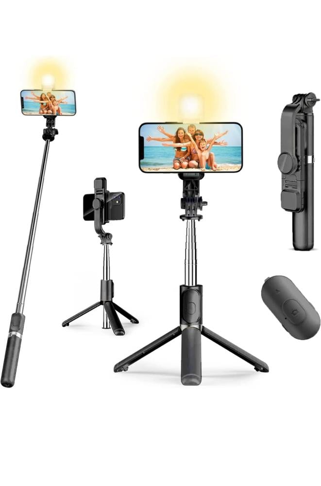 عصا سيلفي بإضاءة 4 في 1 مع حامل ثلاثي، جهاز تحكم عن بعد، 3 أوضاع إضاءة و6 مستويات سطوع، دوران 360 درجة، حامل ثلاثي للسطح المكتبي محمول، لموبايل ايفون والاندرويدد، للبث، أسود